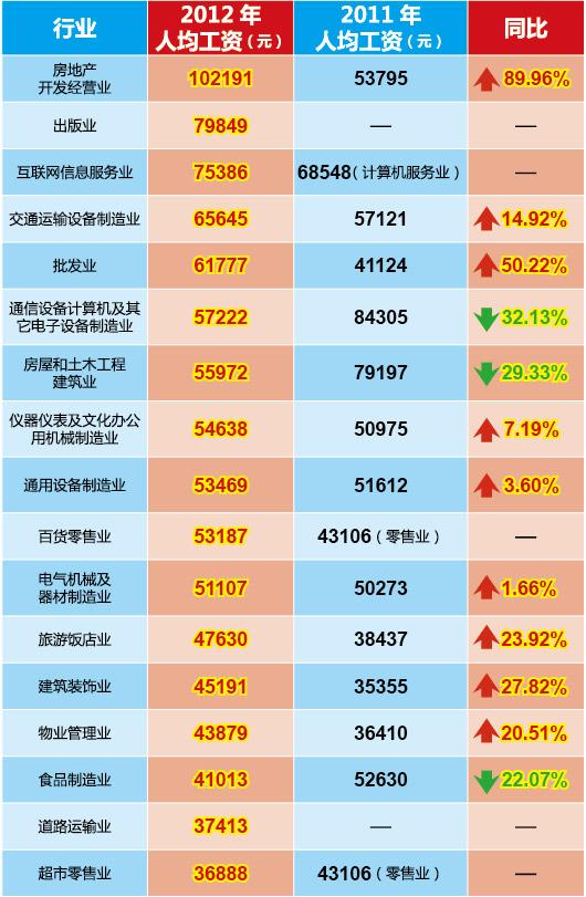 房地产开发经营业平均年薪102191元,同比上涨近九成;出版业、互联网信息服务业平均年薪分别为79849元和75386元,位列第二、三位
