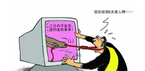 网店国庆七天放假歇业,却要赔偿三万多元违约金。珠海一淘宝店主自称遭遇恶意买家,趁网店放假,故意拍下大笔订单,然后利用淘宝“买家拍下订单付款后,商家必须在3天内发货,否则支付成交额的30%作为违约金”的硬性条款,套取巨额违约金。(来源:南方都市报 南都网