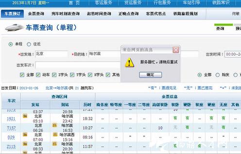 中新网1月7日电 (财经频道 何敏)今日,全国旅客就可通过电话和网络订票系统预订春运首日(1月26日)的火车票,为期40天的铁路春运大幕正式拉开。中新网财经频道记者登陆12306网站订购春运首日火车票发现,该网站再次出现“服务器忙,请稍后重试”的提示,但登陆、查询、预订等功能基本能顺利完成,直接拨打订票热线95105105能够顺利接通,并无占线。