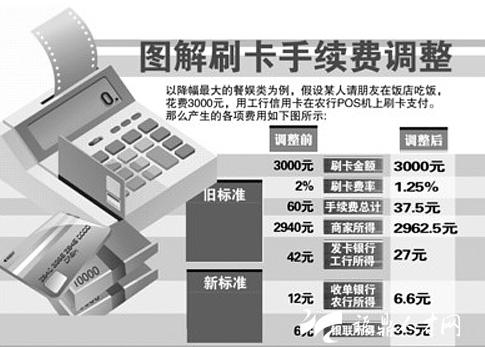“我行按照国家主管部门制定的刷卡手续费调整方案,将于2013年2月25日对您使用的我行商户通终端刷卡扣率进行调整……”昨天,省城芜湖路万达广场的一位经营户收到建行安徽省分行送来的一份《商户通刷卡手续费调整告知函》。据了解,目前我省多家银行正在为调整刷卡手续费做准备,新的收费标准维持了现行刷卡手续费行业差别化定价,总体下调幅度超过20%,而其中餐饮娱乐类下调幅度高达37.5%。