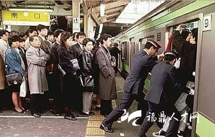 东京地铁在高峰期,人们都是被装进去的。地铁推手们在早晚高峰期把人们推进有缝隙的车厢。当地铁里的人超过容载量的200%的时候,地铁的们就会关不上,但是地铁推手会不停的推人进入车厢。当他们第一次出现在地铁站的时候,他们被称为乘客疏散人员,他们大多都是兼职的学生。但是现在,这个职业成了固定的职业,有兼职也有全职。