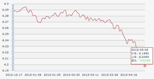 中新网5月8日电 据央行网站消息,中国人民银行授权中国外汇交易中心公布,2013年5月8日银行间外汇市场人民币汇率中间价报1美元对人民币6.1980元,较前一交易日大涨103基点,一举突破6.20整数关口,并再次创下汇改以来新高。