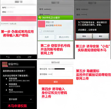 据360手机卫士专家分析,“隐身大盗二代”相比一代木马更为隐蔽。首先它改变了窃取短信内容的方式,不再通过转发短信进行,而是采取联网上传短信到黑客服务器的方式;其次,“隐身大盗二代”采取了连环攻击手段,在用户安装完伪装成流行应用的“大包”之后,诱导用户再安装一个伪装成账户安全验证的“小包”,大包专门窃取账号密码、身份证号等,“小包”则案中监控、识别受害者短信并联网上传。