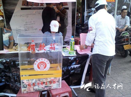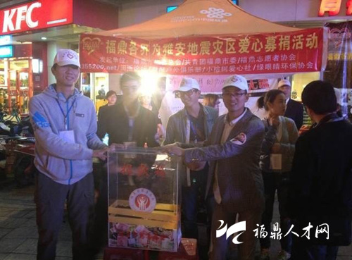 "一方有难,八方支援“。26号,27号,福鼎市慈善总会、共青团福鼎市委、福鼎志愿者协会355200.net(福鼎论坛)协同闽浙论坛、凝聚户外俱乐部、小榕树爱心社、绿眼睛环保协会紧急行动起来,组织委雅安地震灾区开展现场募捐活动。