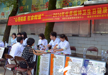 10月10日是第22个世界精神卫生日。今年的活动主题为“心理健康,社会和谐”,旨在号召全社会积极参与精神卫生工作,共同承担防治责任和义务,形成理解、接纳、关爱精神障碍患者的社会氛围,保护和促进公众心理健康。10日上午,我市精神病人疗养院与市疾控中心、桐山卫生服务中心联合在市府路开展精神卫生宣传与义诊活动。