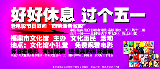 为推动我市公共文化服务体系建设加快,加大实施“文化惠民”的群众性工作,福鼎市文化馆在2015“五一”期间举办“《向劳动者致敬》经典老电影节”播映文化活动,日前引进了一批曾经脍炙人口、风靡千家万户、持续影响几代人成长的五十、六十、七十年代国产拍摄的经典黑白、彩色电影故事片(相对清晰),计划在“小长假”期间文化馆小礼堂的300英寸高流明工程机播映让广大劳动者及市民朋友“追寻那时花开”再一次找到当年记忆中的文化快乐。