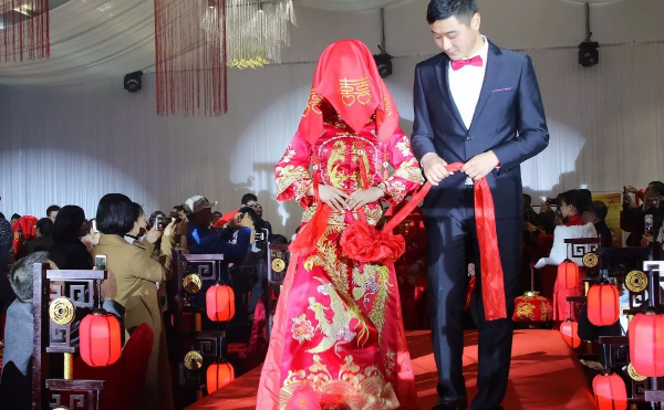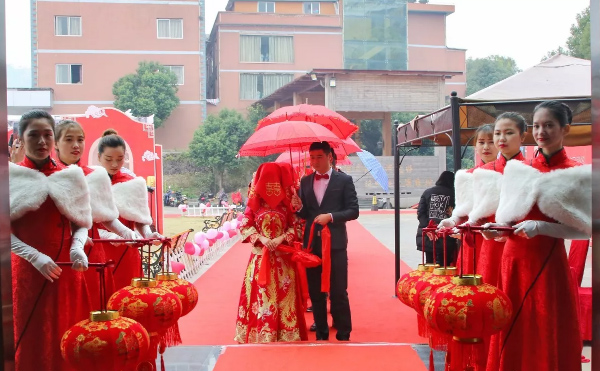 据了解,此次婚礼全程采用中式嫁娶习俗,新娘头盖红盖头,新人手拿红绣球,跨火盆、跨马鞍等婚礼流程与传统中式仪式相同。在活动之中,还在新人之间进行抽奖活动,一、二、三等奖奖品分别为价值不等的旅游券。