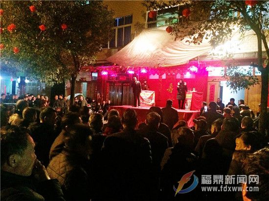 2月9日晚,在点头镇文昌社区的依山街旁,一场温馨、热闹的家庭祝寿活动正在举行。简易的小舞台中央挂着一幅“寿”字挂幅,两三位当地的桐诗歌手正在表演。声声祝福,浓浓情意,让两位老寿星及现场观众喜笑颜开,现场歌声、笑声、喝彩声和掌声此起彼伏,寓教于乐。